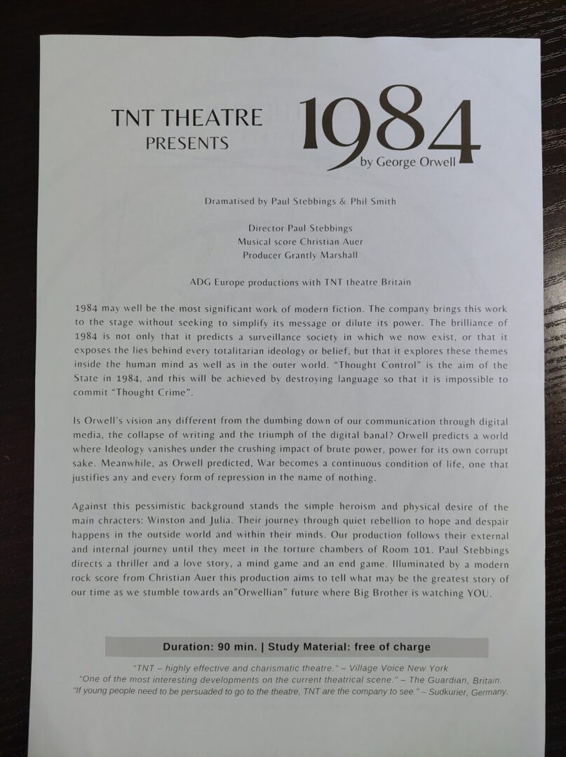 U utorak 4. studenog 2025. održana je predstava prema romanu Georgea Orwella ,,1984.” u Lori. Predstava mi se svidjela jer je utjelovila roman u punom smislu i prikazala stanje Oceanije i Velikog Brata baš onako kako je opisano u knjizi. Imam osjećaj da bi Orwell bio ponosan na izvedbu u kojoj jasno vidimo nedostatke totalitarnog režima i upozorenje na današnju stvarnost, u kojoj je većina mladih ovisna o mobitelima i sve manje čita, čime se smanjuje potencijal njihova vokabulara (jezik Newspeak).